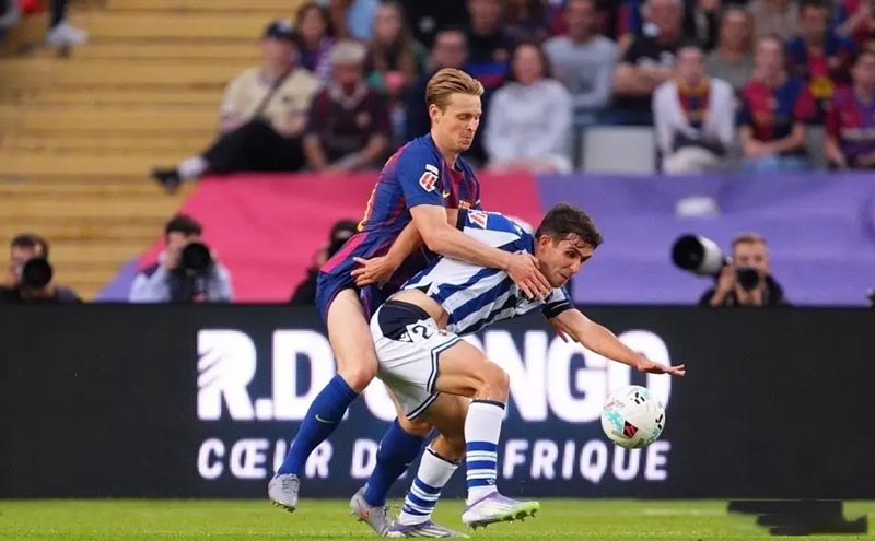 Barcelona's attack remained stagnant until, in the 31st minute, Barrenetxea dribbled past Koundé's defense, sending a cross into the net for Odriozola, who found the back post and scored, making it 0-1! Real Sociedad, who had been on the defensive, unexpectedly took the lead, and their defensive resolve became even stronger.