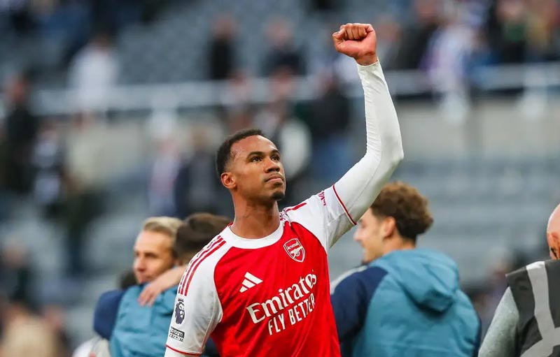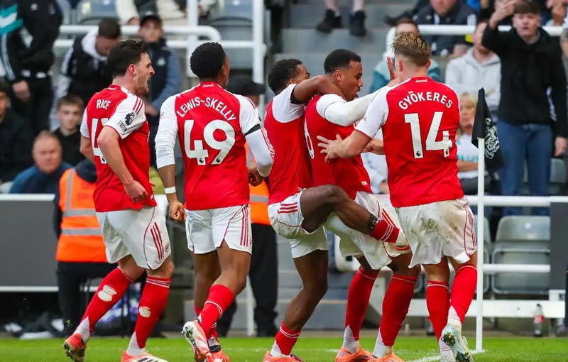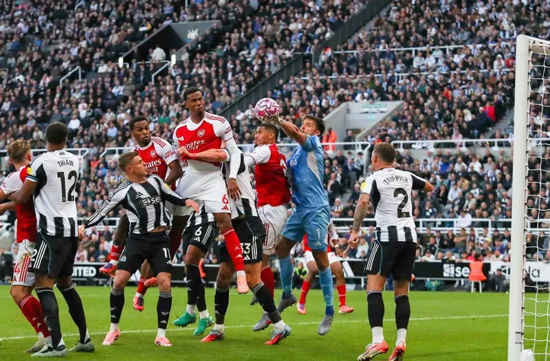 In the 96th minute, Arsenal scored the winning goal! Also from a corner kick, Gabriel received a cross from Ødegaard, leaped high, and headed the ball into the net! Arsenal 2-1 Newcastle United!