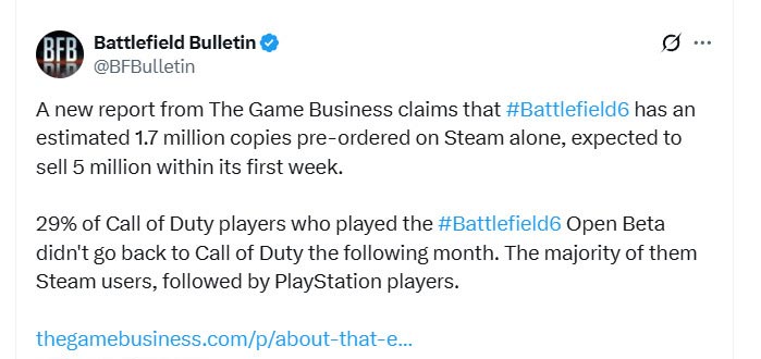 According to The Game Business, pre-orders for the PC Steam version of Battlefield 6 alone have reached 1.7 million, with first-week sales expected to reach 5 million.