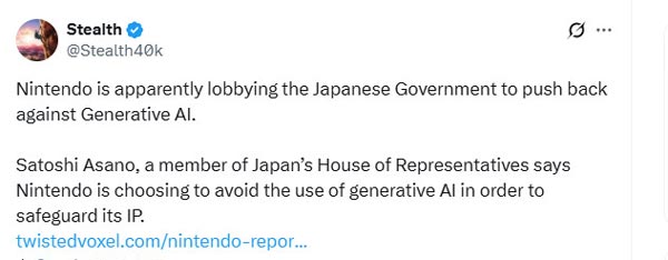 Nintendo is actively intervening in the Japanese government's AI policy discussions. According to Japanese media reports, Tetsu Asano, a member of the Japanese Diet and the Democratic Party for the People, recently revealed on social media that Nintendo has begun lobbying the government to resist the growing use of generative AI.