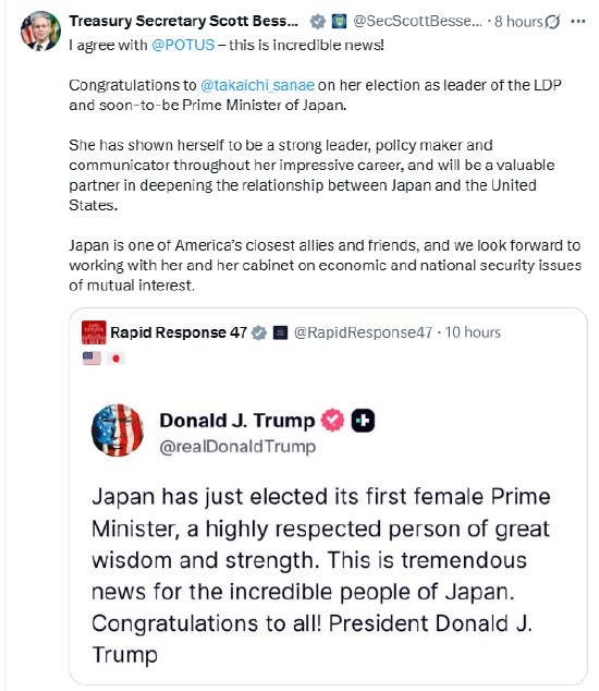 U.S. Treasury Secretary Jeffrey Bessant later congratulated Takaichi Sanae on becoming the new president of the Liberal Democratic Party, saying he agreed with Trump that it was "incredible news" and expressed hope to work with her cabinet on "economic and national security issues of mutual interest."