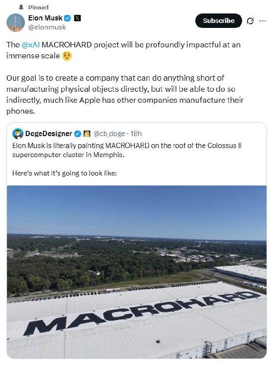 He further explained, "xAI's MACROHARD project will have profound impact on a massive scale. Our goal is to create a company that can do everything except directly manufacture physical objects, though it will be able to do so indirectly, much like Apple lets other companies manufacture their phones."