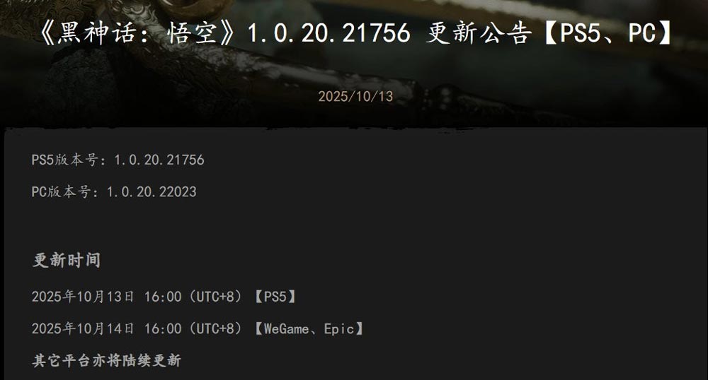On October 13th, Black Myth: Wukong announced the details of its latest major optimization patch and stated that it would be rolled out to various platforms. The first platform to receive the update was the PS5, which was announced alongside the announcement. On October 14th, an official update announced the PC update.