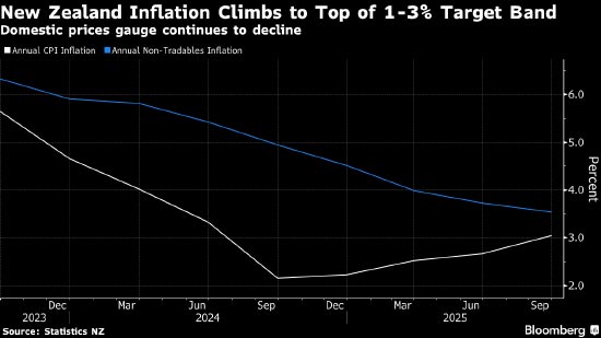New Zealand's inflation accelerated in the third quarter, reaching the top end of the Reserve Bank's 1-3% target range, though core price pressures have eased and policymakers have signaled further policy easing.