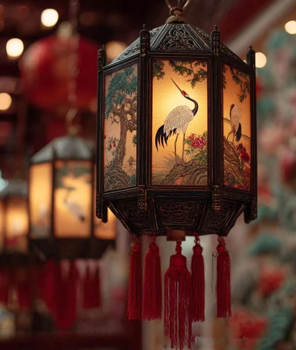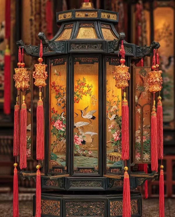 Traditional lanterns were octagonal, hexagonal, and quadrangular in shape, with designs on each screen often depicting auspicious symbols such as dragons and phoenixes, longevity, and good fortune.